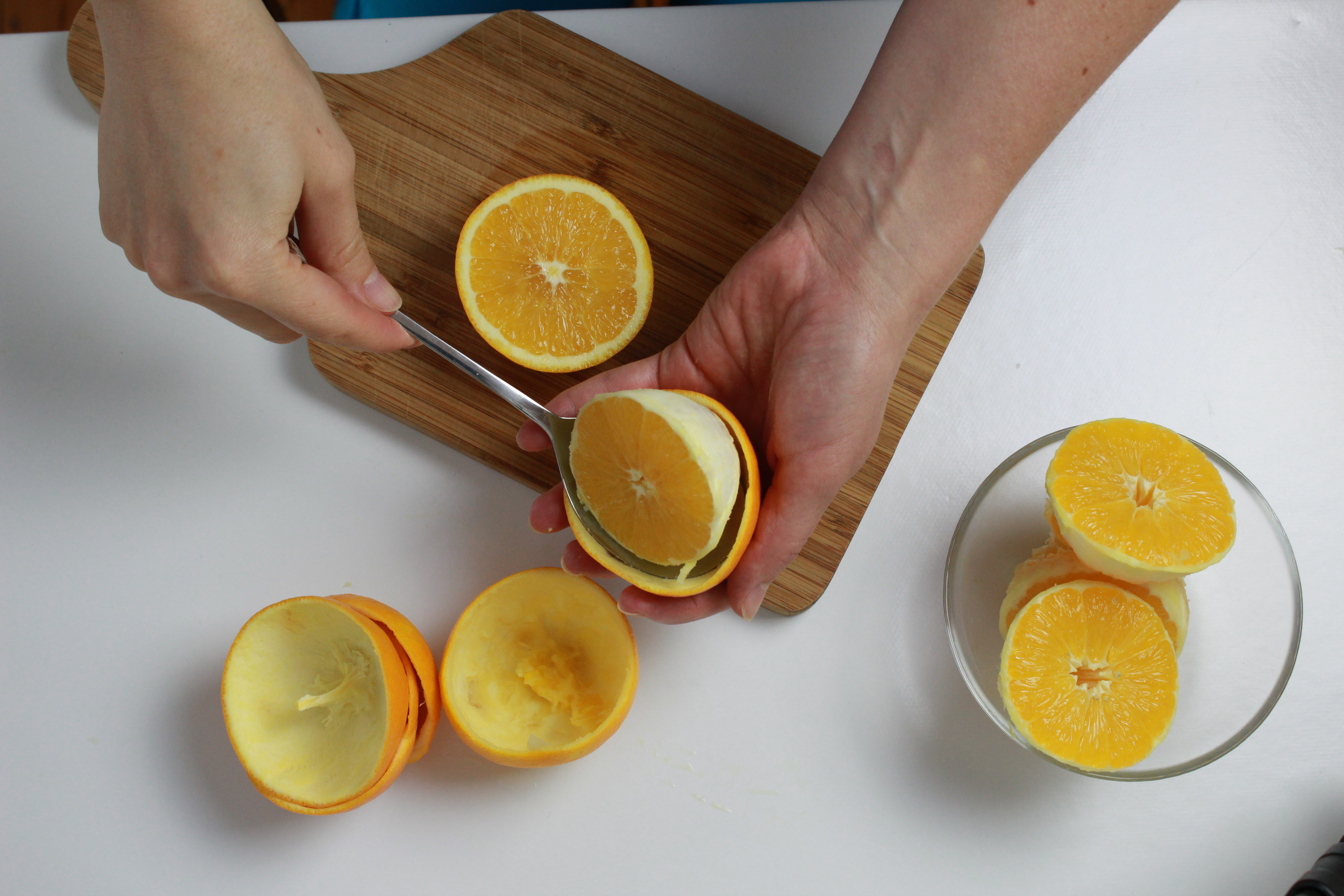 2. Mit einem Esslöffel das Fruchtfleisch aus beiden Orangenhälften vorsichtig herauslösen.