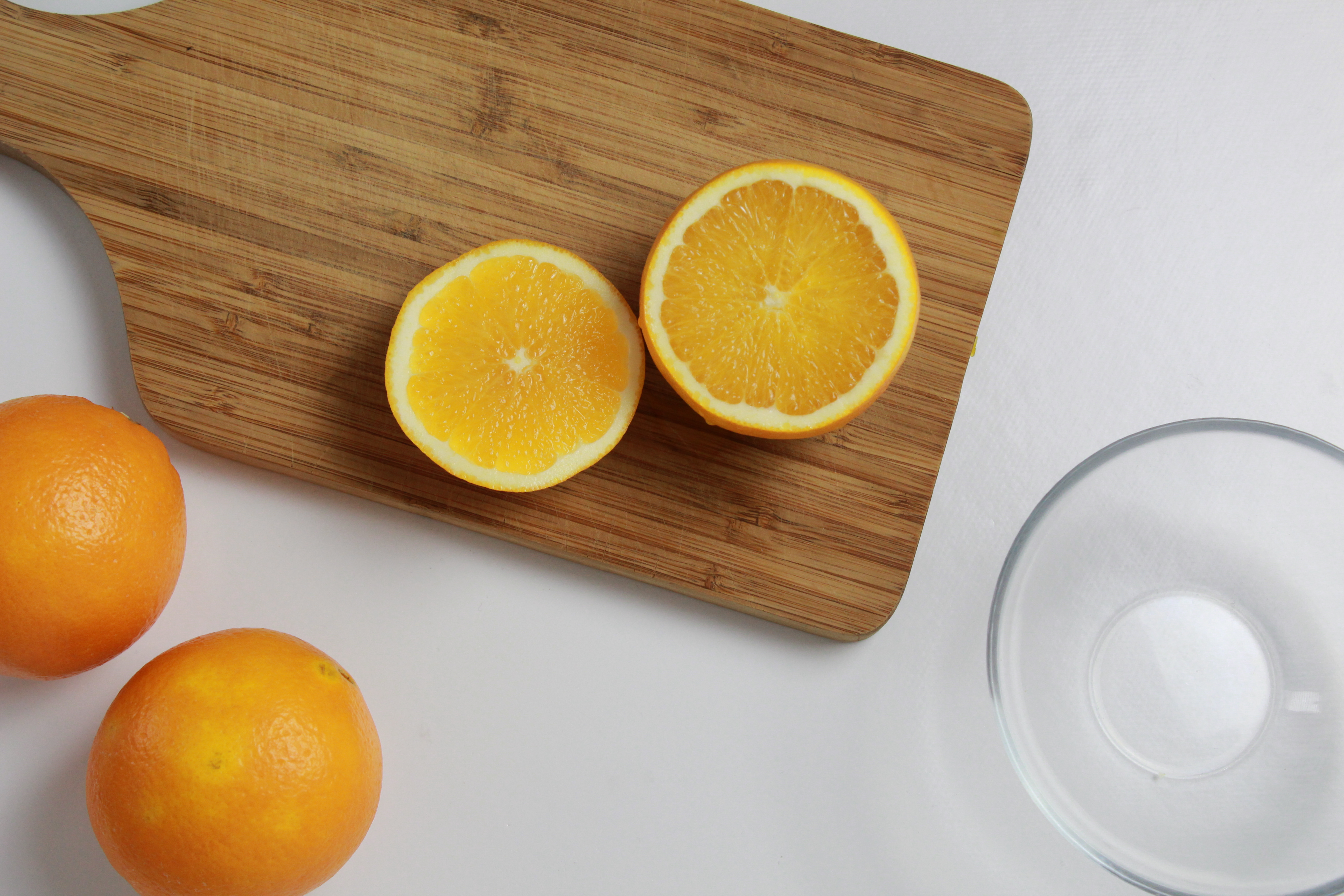 1. Die Orangen auf einer Schneidunterlage mit einem Messer halbieren.