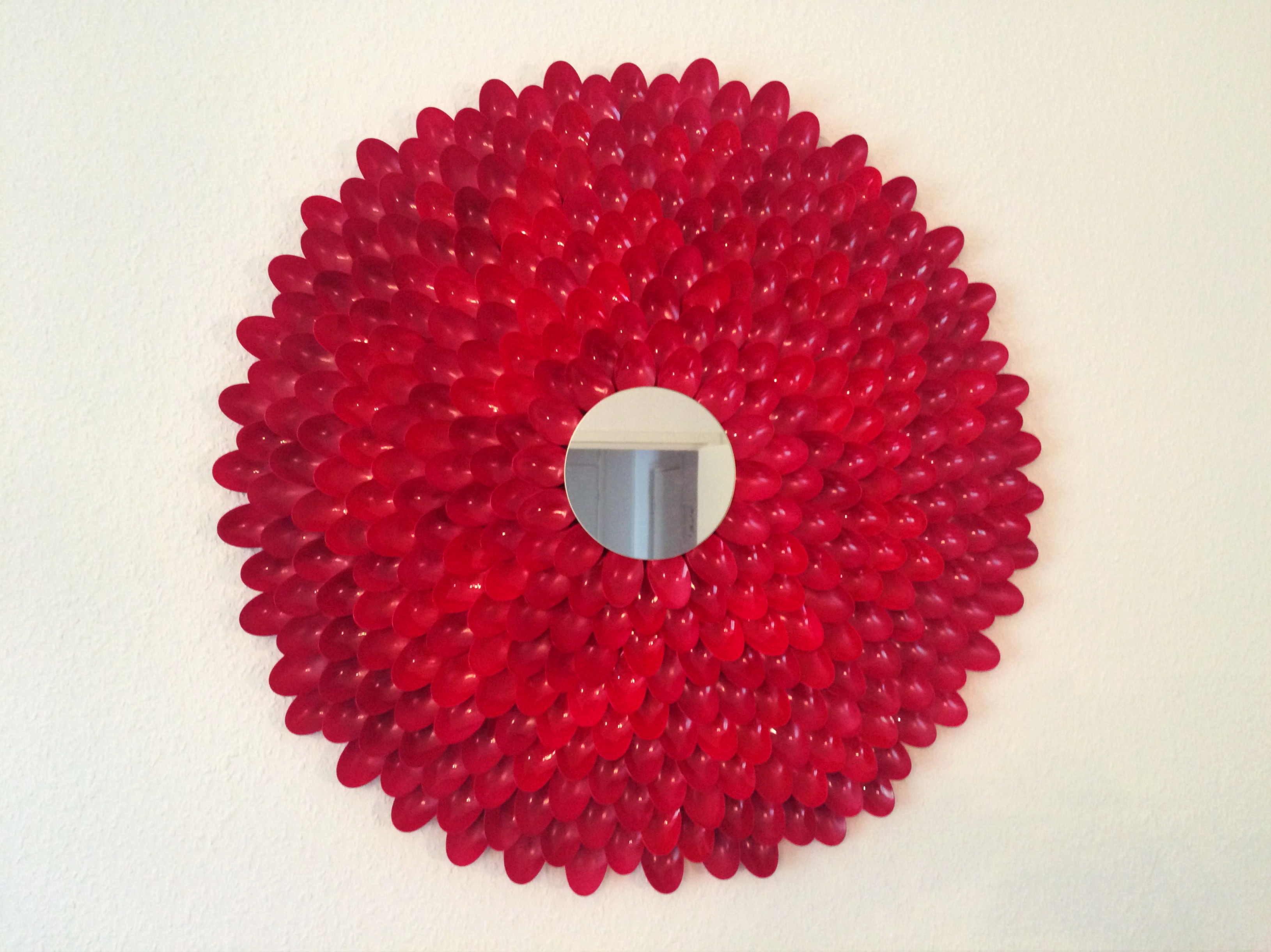 4. Klebt nun mit Hilfe eurer Heißklebepistole eine Reihe gefärbter Plastiklöffel auf die Rückseite des Spiegels und lasst es gut trocknen.