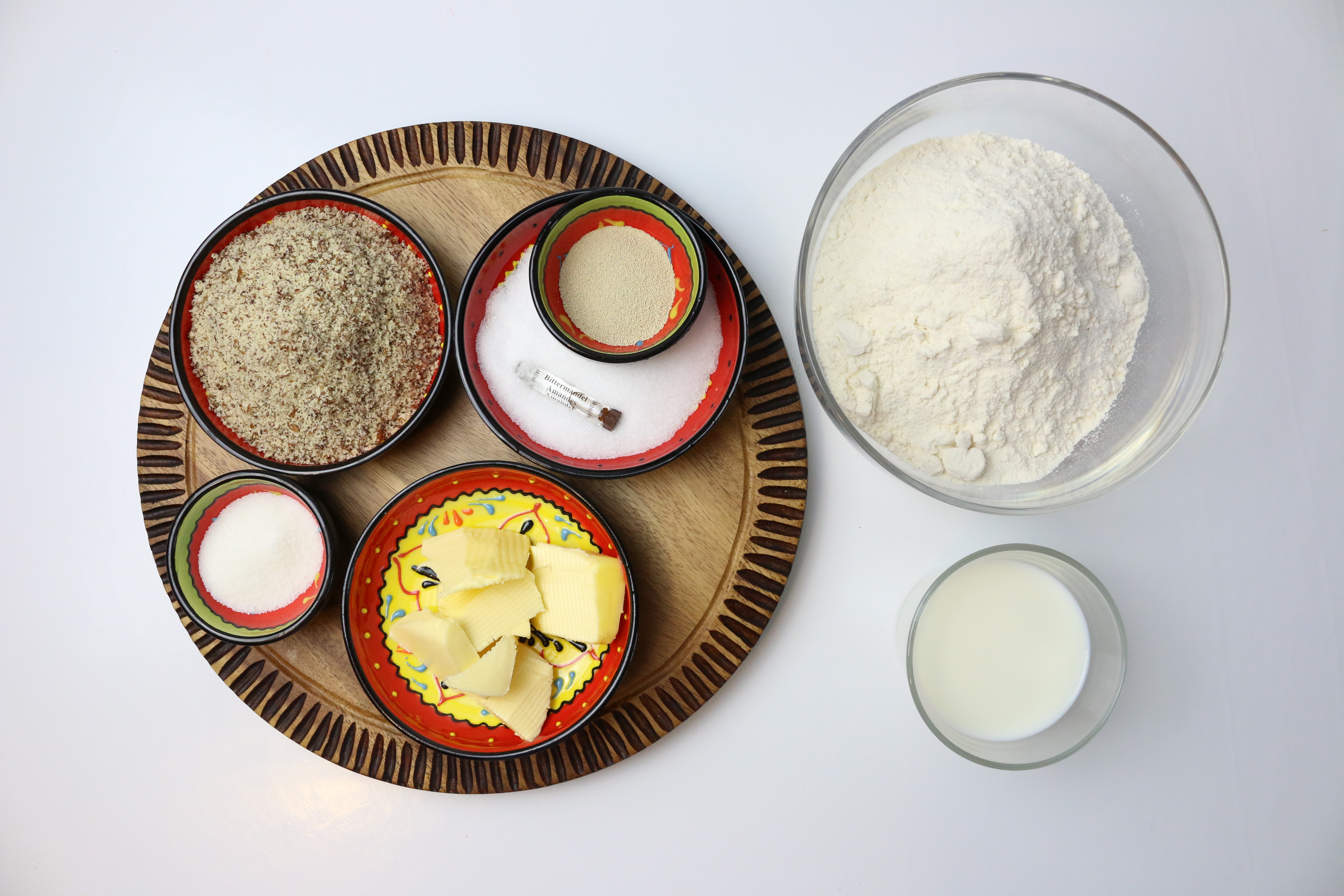 1. Mehl, Mandeln, Zucker, Vanillezucker und Hefe mischen. Bittermandelaroma, Eier und die weiche Butter dazugeben Nach und nach die Milch hinzugießen und zu einem Teig verkneten. Es muss sich ein geschmeidiger Teig ergeben. Zugedeckt den Teig ca. eine Stunde an einem warmen Ort gehen lassen, bis sich der Teig verdoppelt hat.