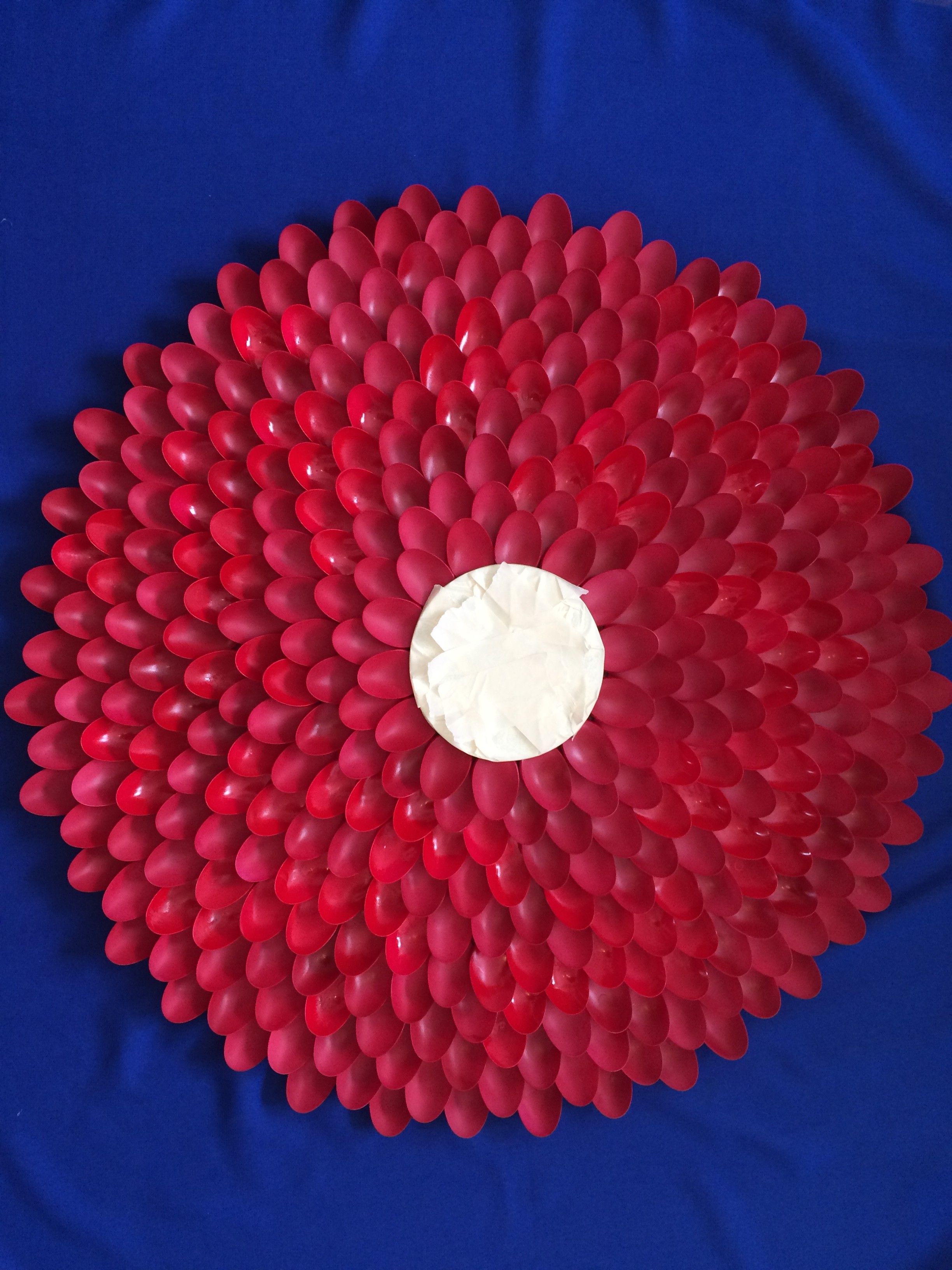 4. Klebt nun mit Hilfe eurer Heißklebepistole eine Reihe gefärbter Plastiklöffel auf die Rückseite des Spiegels und lasst es gut trocknen.